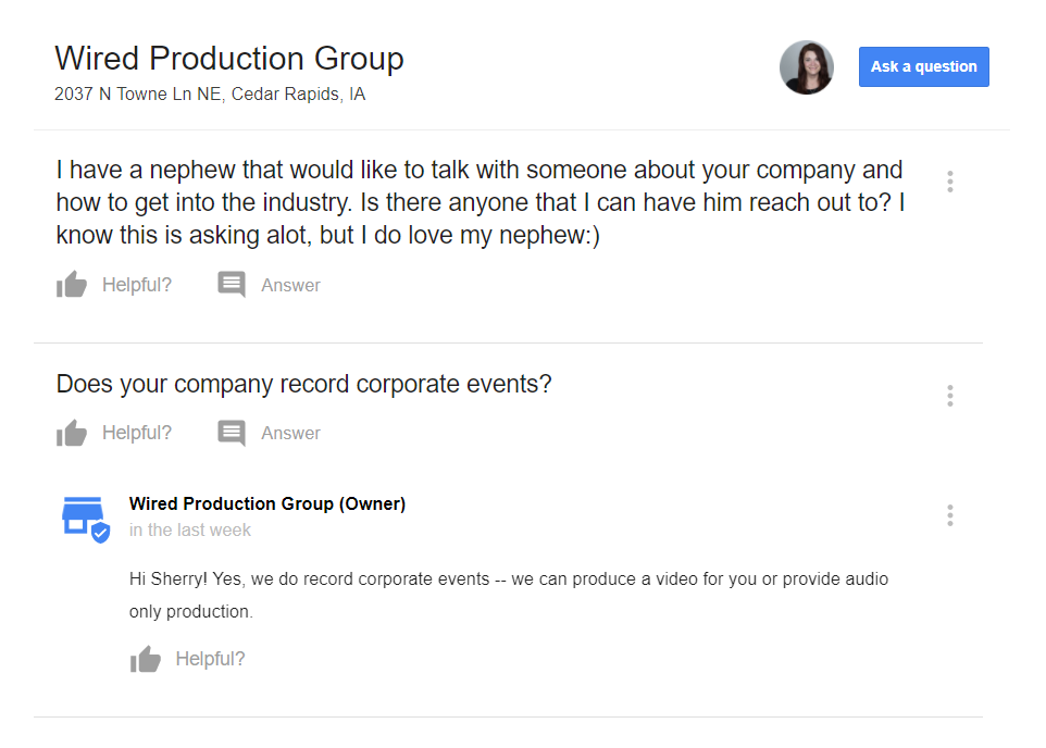TIP: It’s important to note that just like “Suggest an Edit” on GMB, anyone can answer questions asked of your business. Therefore, you want to keep an eye out and make sure you answer questions quickly and ensure that if someone else answers a question, that the answer is accurate. If you find that someone is abusing your GMB listing’s Q&A feature, reach out to the Google My Business support forums.